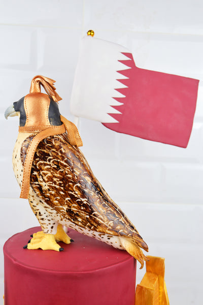 كيكة من ثلاث طبقات باللونين العنابي والذهبي، مزينة بمعالم قطر الشهيرة، وتتوجها صقر يحمل العلم الوطني—تحفة فنية قابلة للأكل تُجسّد تراث قطر وأفقها الحديث.
