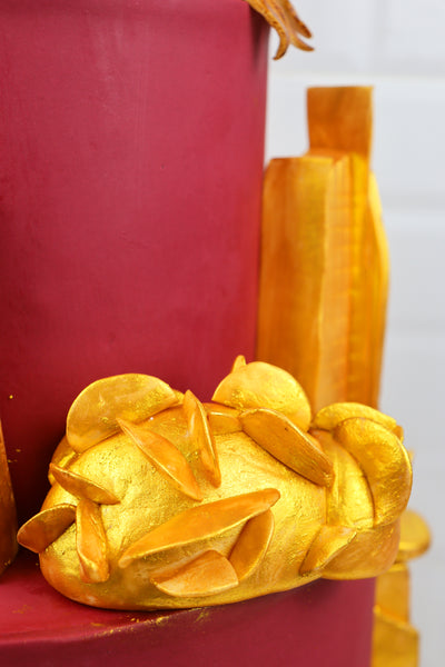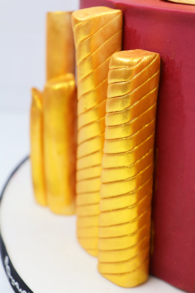 A multi-tiered maroon and gold cake featuring iconic Qatari landmarks, crowned with a falcon holding the national flag—an edible tribute to Qatar’s heritage and modern skyline.
