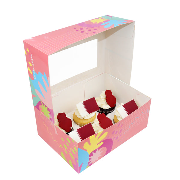 ستة حبات من الكب كيك المزينة بكريمة بيضاء، بتصميمات علم قطر واللون العنابي مع خريطة الدولة، ومصفوفة بشكل أنيق في صندوق للاحتفال بروح الوطنية.