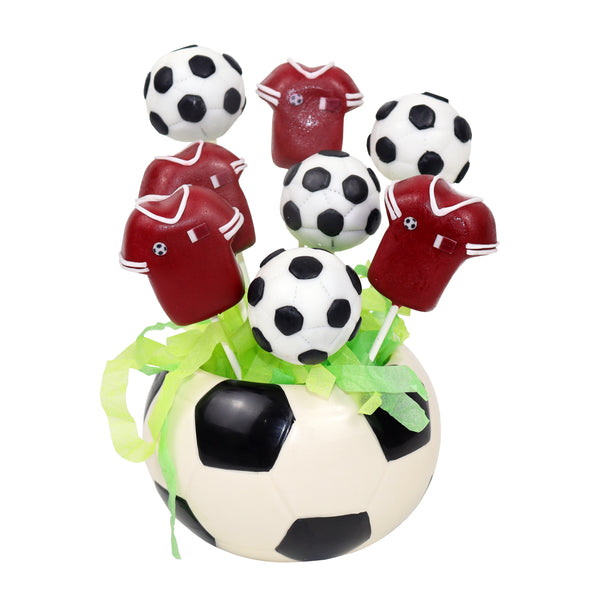 Soccer-themed cake pops featuring red jersey designs and classic soccer balls, presented in a sporty display.كيك بوبس بثيم كرة القدم، بتصميم قمصان حمراء وكُرات قدم كلاسيكية، بشكل رياضي جذاب.