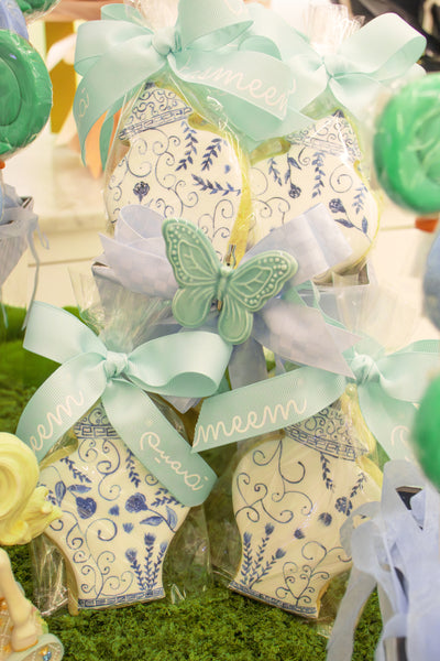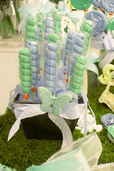 A whimsical, blue-themed table arrangement featuring lollipops, cookies, candies, chocolates, carousel accents, and wrapped chocolates.