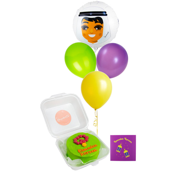 Colorful Ramadan celebration set with balloons, a mini cake, and a festive card.مجموعه مميزه للاحتفال برمضان مع بالونات و ميني كيك وكارت