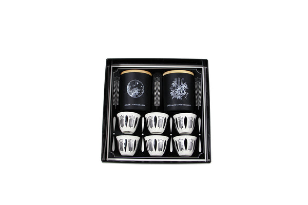 A set of 6 pieces tea cups and a scented candle in a box.