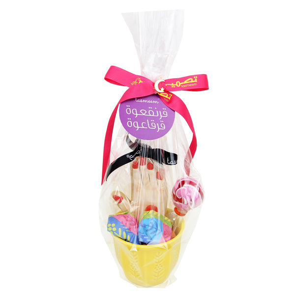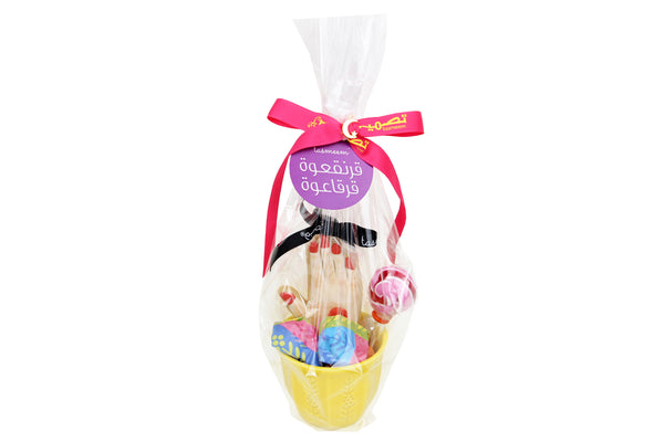 كوب احتفالي مليء بمفاجآت القرقنقعوه يضم مصاصة، كوكي بطابع خاص، وشوكولاتة مغلفة، مقدمة بشكل جميل لهدية مليئة بالفرح والبهجة