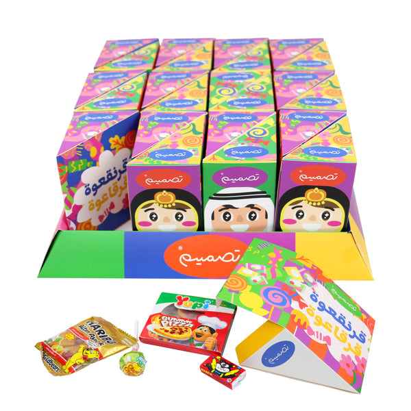 A colorful 24-pieces Garangao box filled with assorted sweets, wrapped in playful designs and traditional charm.٢٤ صندوق للقرنقعوه ، مليئة بتشكيلة متنوعة من الحلويات، مغلّفة بتصاميم مرِحة