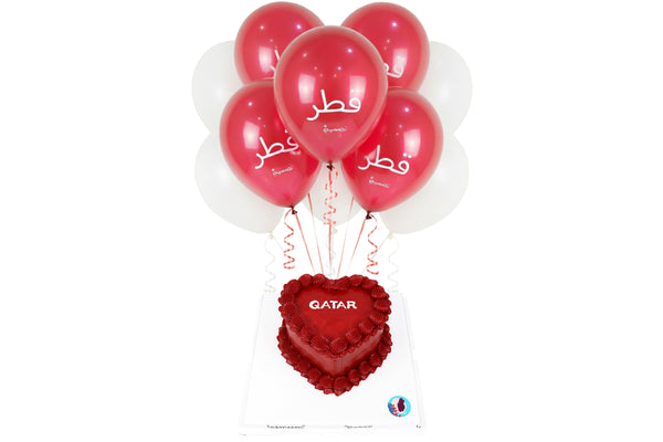 A heart-shaped red cake with “QATAR” written on top, surrounded by red and white balloons for a festive national celebration.كيكة حمراء على شكل قلب مكتوب عليها "QATAR"، مع بالونات حمراء وبيضاء لاحتفال وطني مبهج.